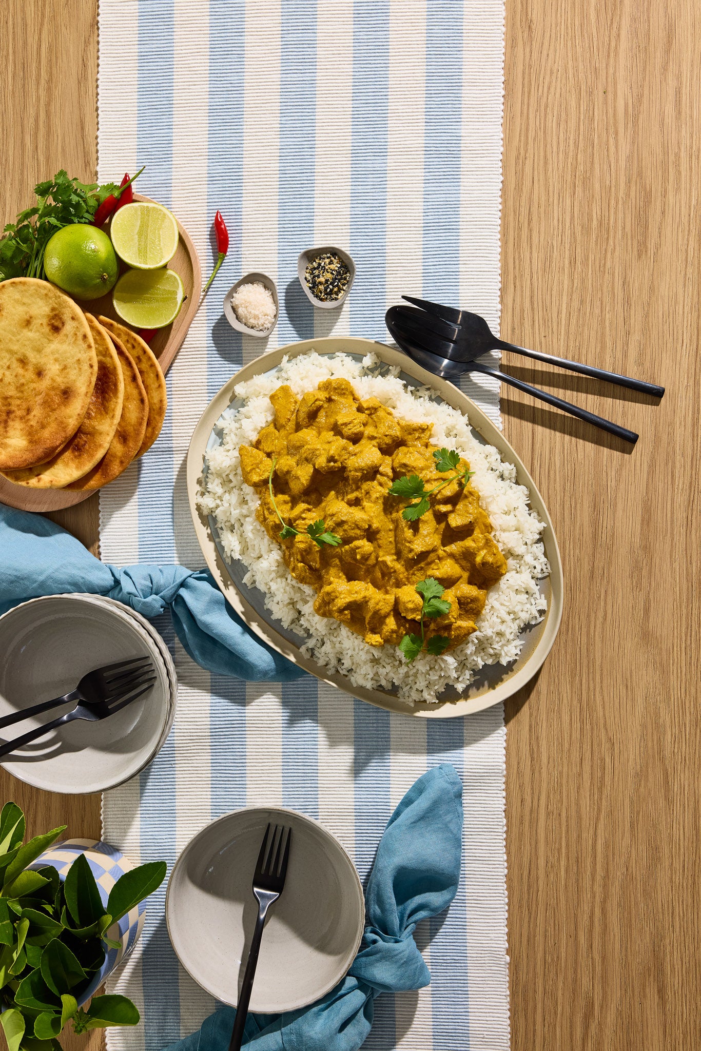 Butter Chicken (50%) (Chicken Breast, Tomatoes, Cream (Milk, Thickeners (407, 412)), Onion, Butter (Cream (Milk)), Spices (Cumin, Fennel Seeds, Garam Masala, Turmeric), Olive Oil, Garlic, Ginger, Salt), White Rice. Contains Milk.