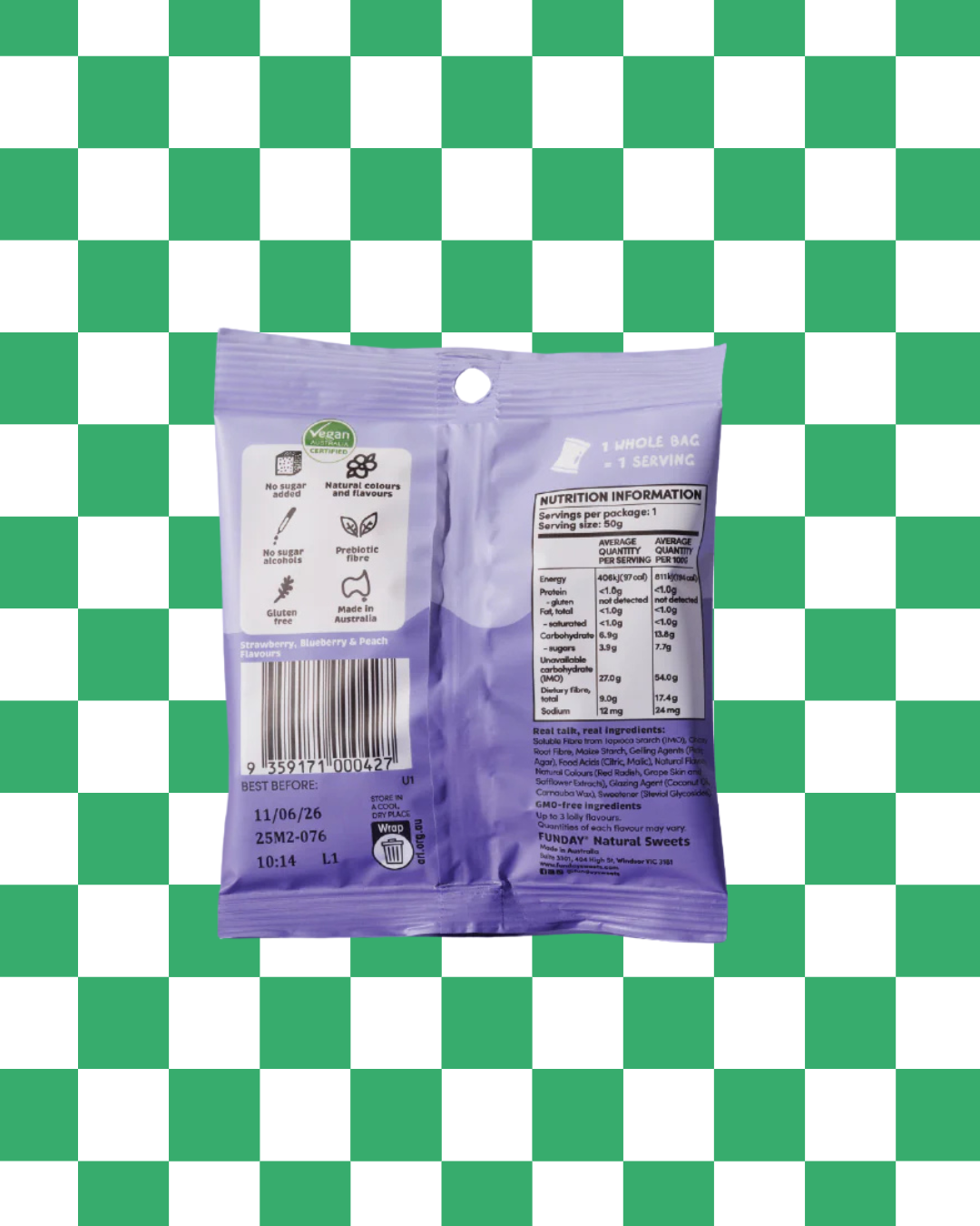Soluble Fibre From Tapioca Starch (IMO), Chicory Root Fibre, Maize Starch, Gelling Agents (Pectin, Agar), Food Acids (Citric, Malic), Natural Flavours, Natural Colours (Red Radish, Grape Skin, Safflower Extract), Glazing Agent (Coconut oil, Carnauba Wax), Sweetener (Steviol Glycosides)
