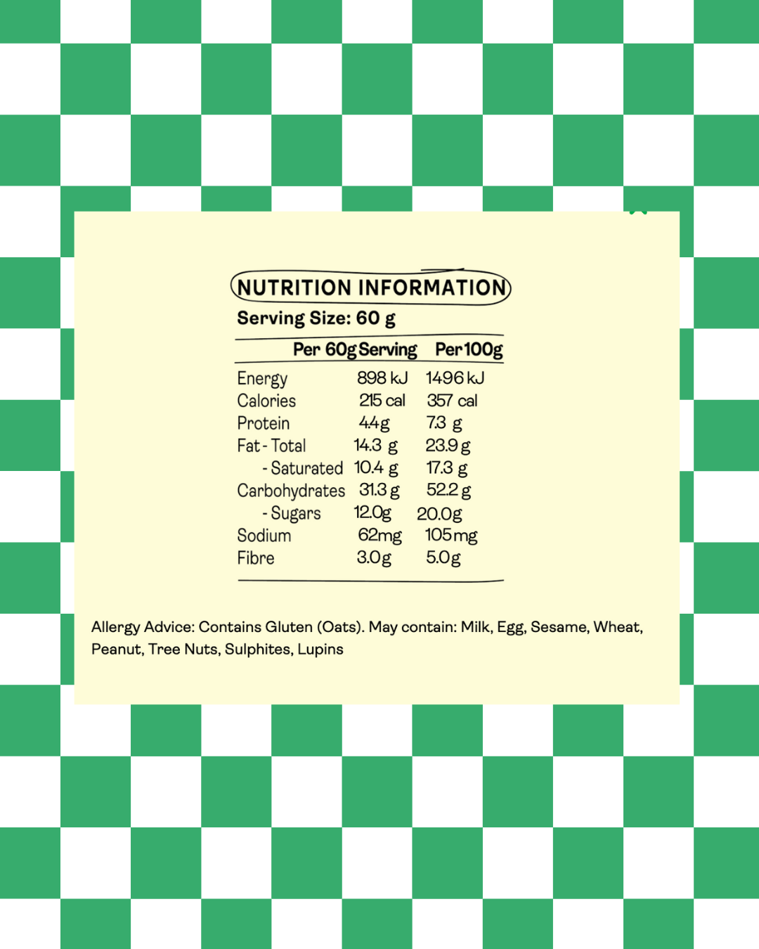 Australian Rolled Oats (44%), Organic Rice Malt Syrup, Organic Coconut Oil, Organic Dark Chocolate Chips (10%) (Organic: Cacao Solids (70%), Cane Sugar, Cocoa Butter, Cocoa Powder), Glycerine, Himalayan Salt. CONTAINS GLUTEN (Oats)